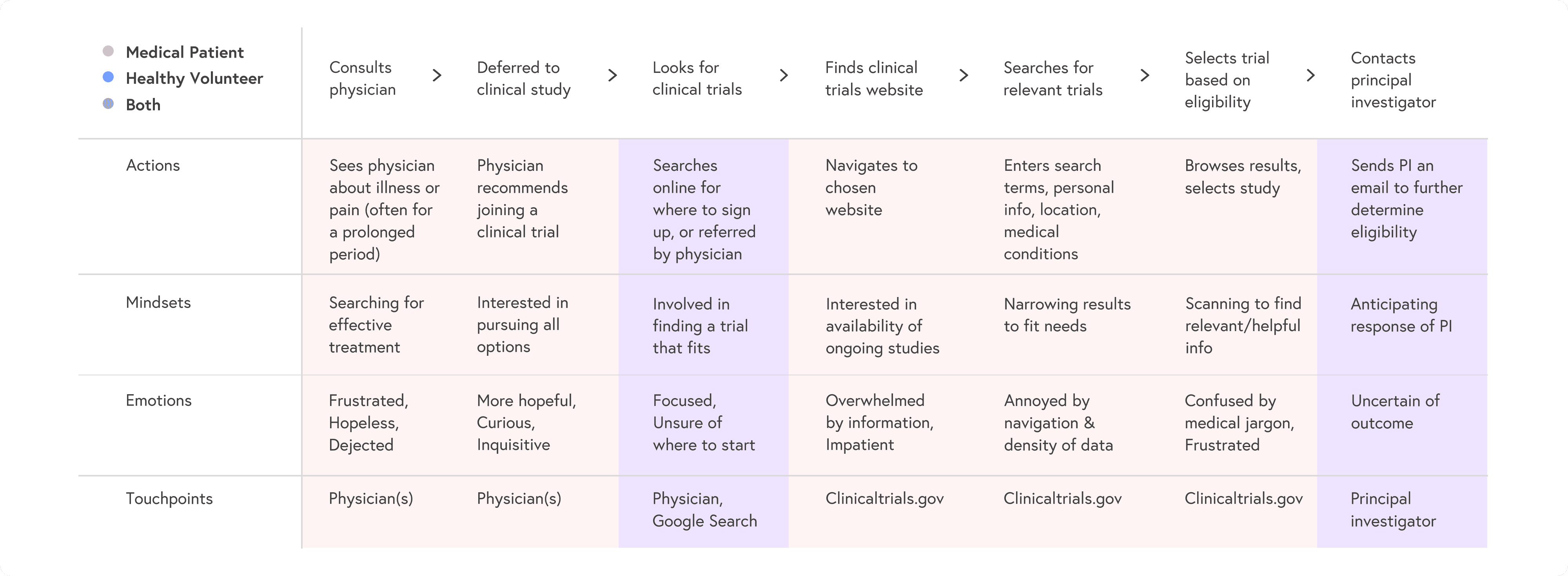 I mapped patient and volunteer journeys from awareness to enrollment, highlighting: