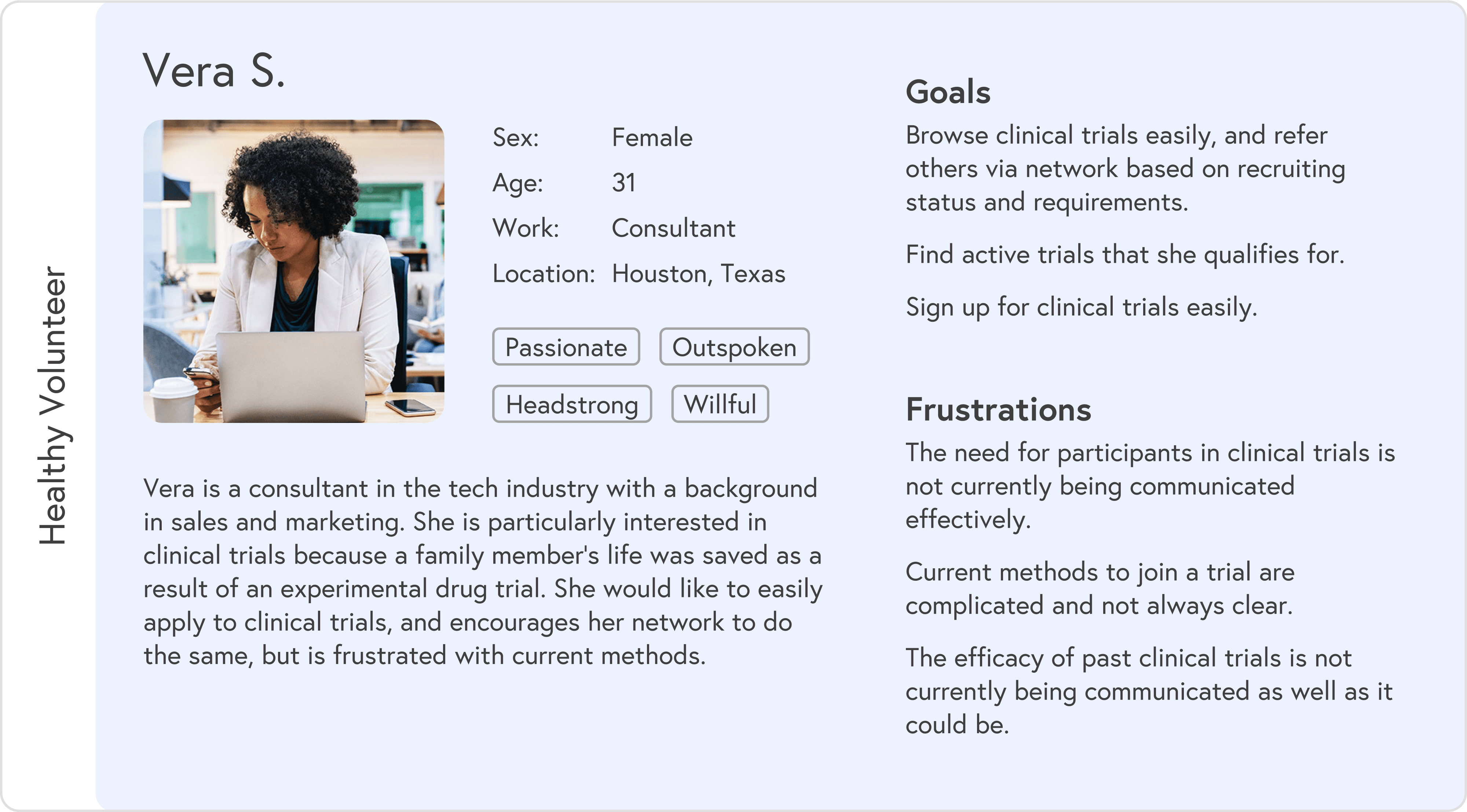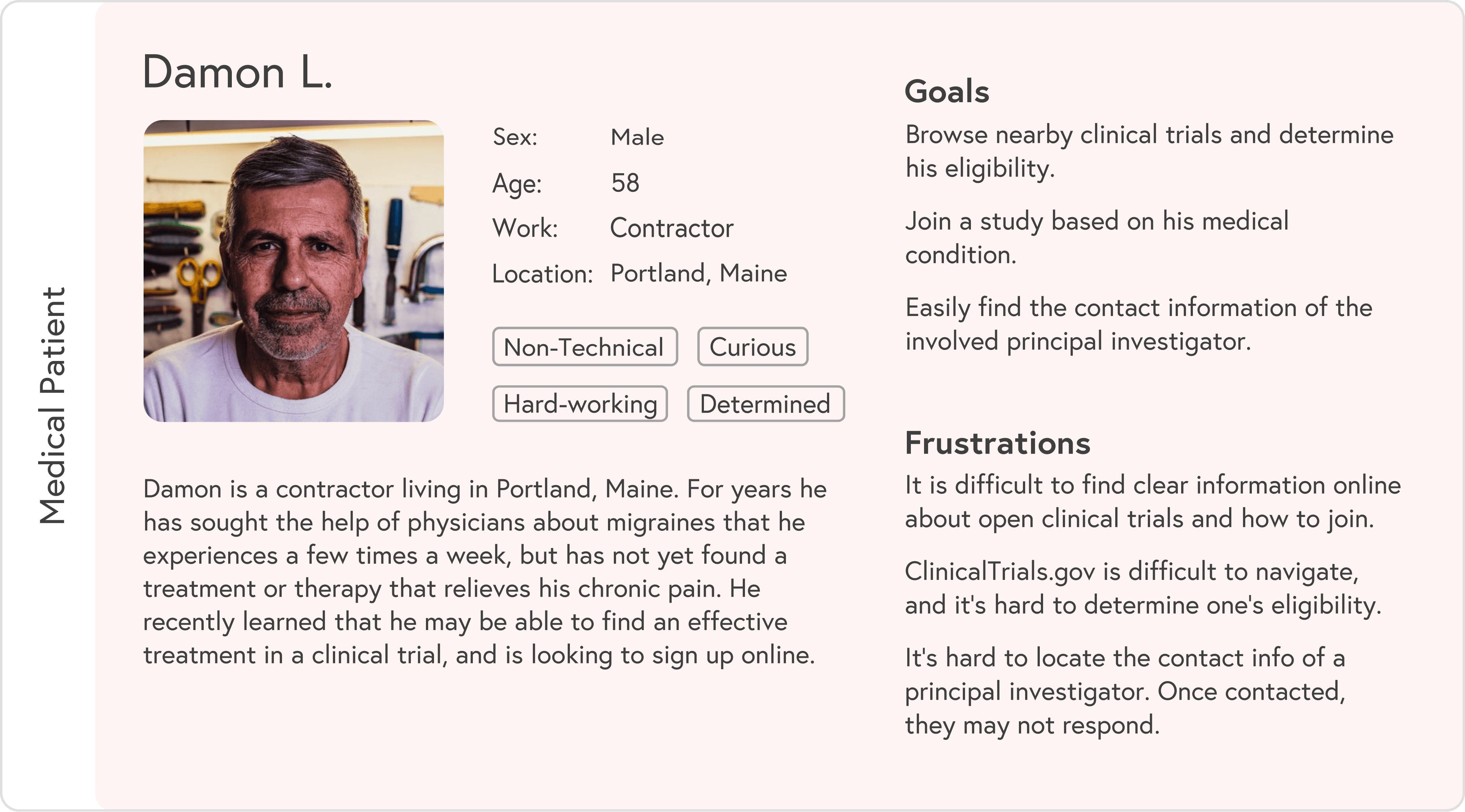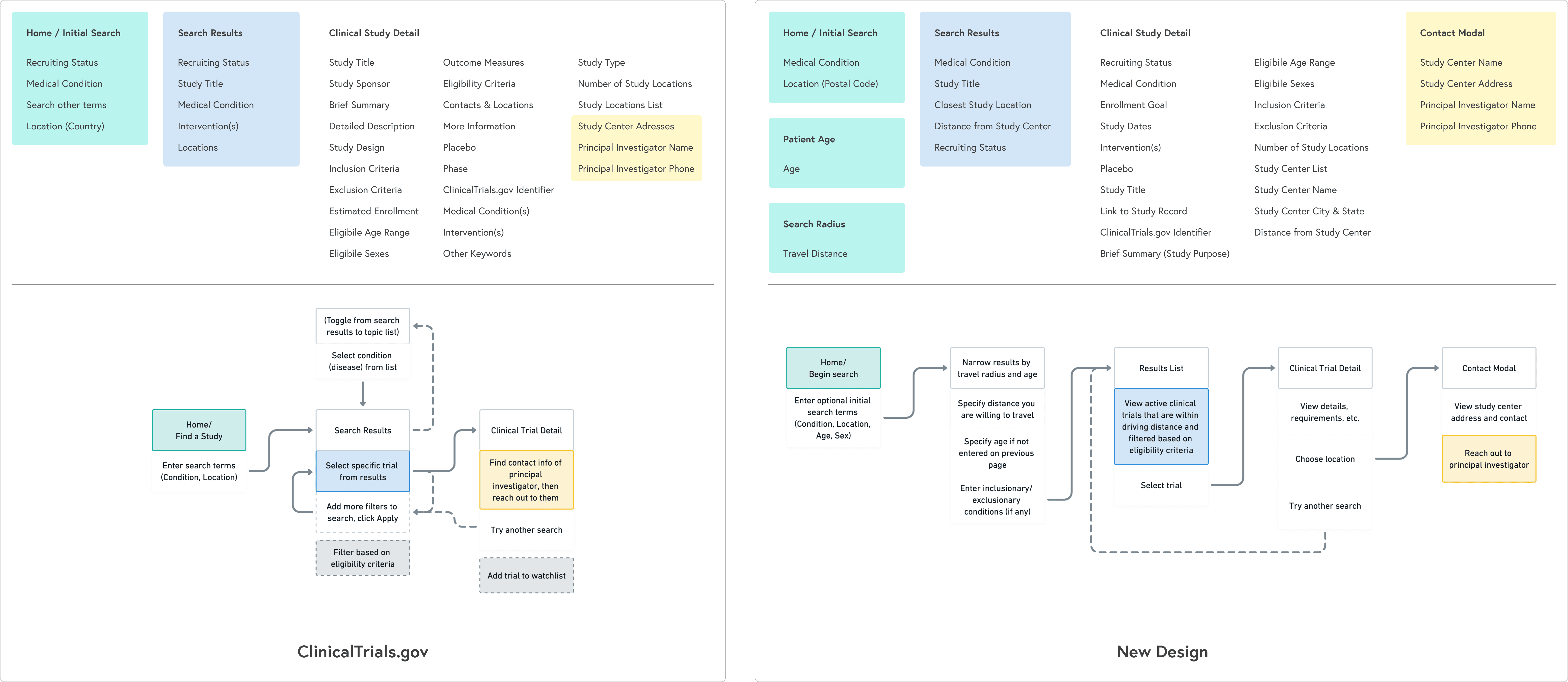 This project explored how to make that journey clearer for patients. I studied how people currently find trials on ClinicalTrials.gov, talked with principal investigators and participants, and then designed an experience focused on: