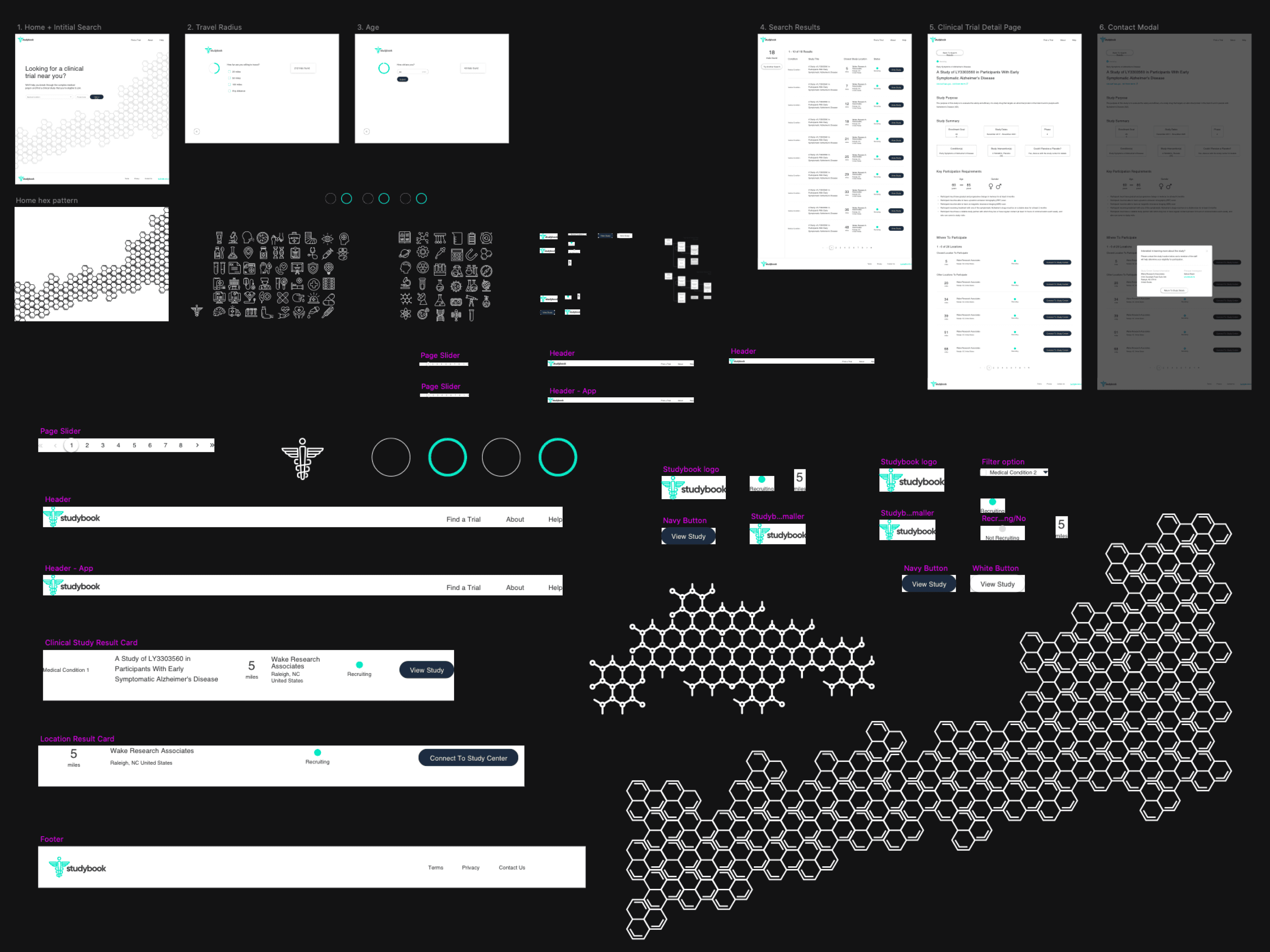 The screens walk users from search → filtered results → study overview → contact information, with a consistent emphasis on “what matters right now” for a patient. I then created a clickable prototype in Figma to test and demonstrate the flow.