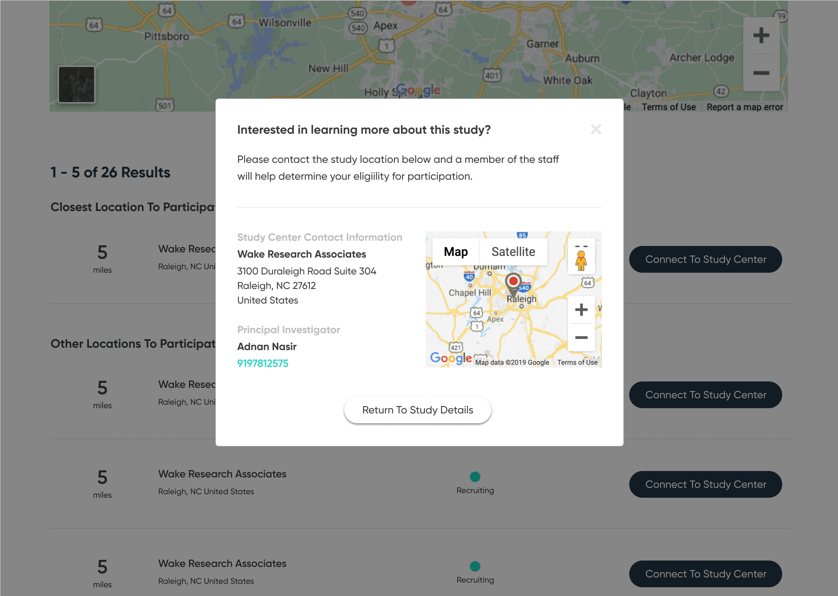 3 principal investigators running actively recruiting studies at Duke, PRA/Hoffmann-La Roche, and Campbell University