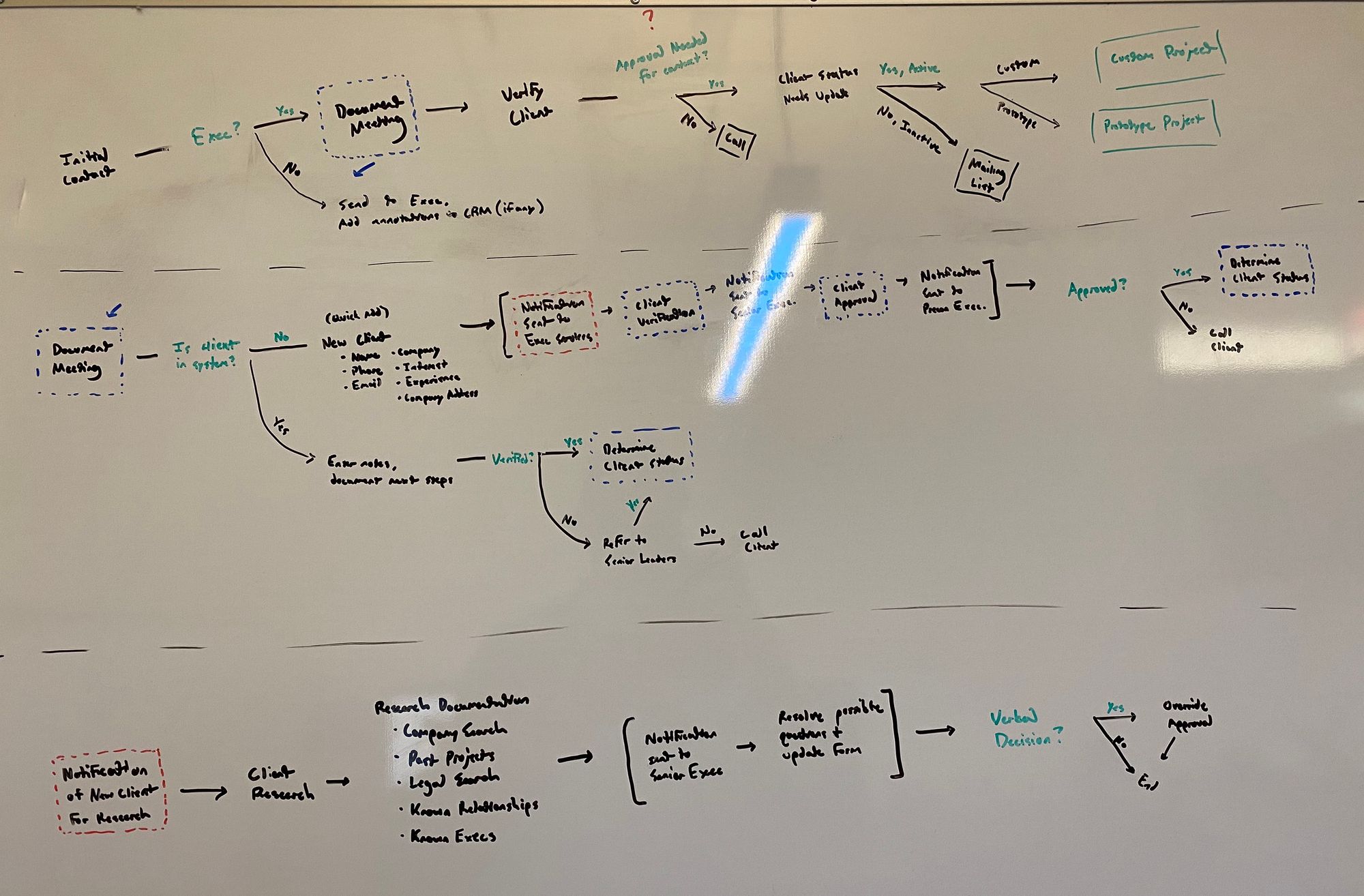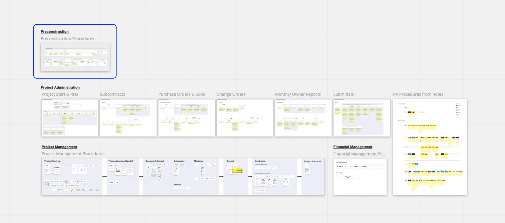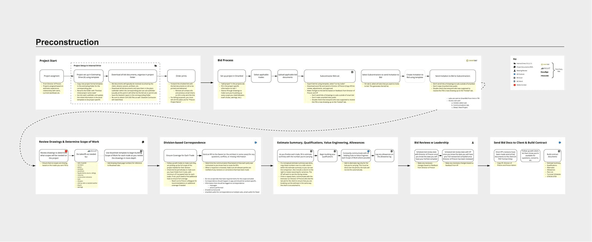 Using the knowledge gained in discovery, I created visual representations of the procedures followed by employees in Preconstruction, Project Administration, and Project Management. For the sake of simplicity, this case study focuses on the Preconstruction process.
